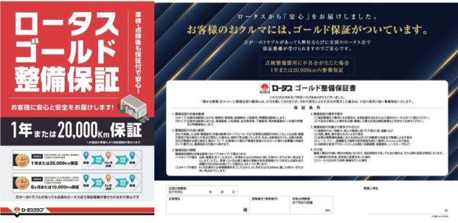 ロータスが取扱うロータスゴールド整備保証は、保証期間または保証距離が業界スタンダードの2倍(保証期間1年または2万kmの長期保証)という手厚い保証をすることにより、他社との差別化ができます。